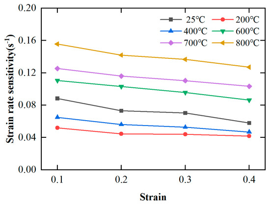 Figure 9 shows the influence of strain on the strain rate sensitivity coefficient of FGH96 superalloy at different temperatures. According to Figure 9, the strain rate sensitivity coefficient decreases with the increase in strain under the experimental temperature conditions. For example, when the temperature is 600 °C, the strain rate sensitivity coefficient decreases from 0.11 to 0.09 with the increase in strain (from 0.1 to 0.4). It is worth noting that the influence of temperature on the strain rate sensitivity coefficient is not clear. For example, for the temperature conditions of 200 °C and 400 °C, the strain rate sensitivity coefficient is lower than the strain rate sensitivity coefficient of 25 °C. However, when the temperature is greater than 600 °C, the strain rate sensitivity coefficient becomes larger and increases with the increase in temperature. At the same time, when the temperature is 800 °C and the strain is 0.1, the largest strain rate sensitivity coefficient is 0.155 (less than 0.2), which shows that FGH96 superalloy exhibits weak strain rate sensitivity.
