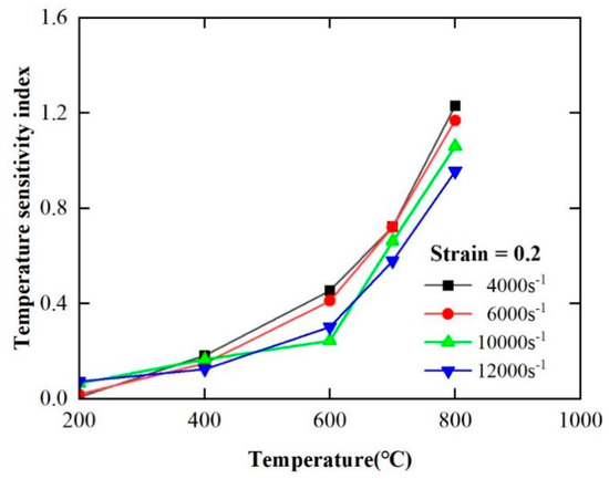 The variation of the temperature sensitivity coefficient of FGH96 superalloy with temperature at different strain rates calculated by Equation (15) is shown in Figure 10. According to Figure 10, the temperature sensitivity coefficient increases significantly with the increase in temperature under the same strain rate. When the strain rate is 4000 s−1, the temperature sensitivity coefficient is 0.1 at 200 °C and reaches 1.2 at 800 °C. At the same time, the temperature sensitivity coefficient decreases with the increase in strain rate. When the temperature is 800 °C, the temperature sensitivity coefficient is 1.3 at 4000 s−1 and decreases to 0.9 at 12,000 s−1. From the above, the temperature sensitivity of the PM superalloy increases significantly with the increase in temperature and decreases with the decrease in strain rate. In summary, FGH96 superalloy exhibits strong temperature sensitivity.