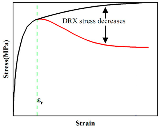 The effect of dynamic recrystallization on the stress–strain curve of the material is shown in Figure 11. If there is no dynamic recrystallization during the deformation process, the flow stress of the material increases slowly with the increase in strain, as shown in the black solid line in Figure 11. When the strain reaches the critical strain of dynamic recrystallization, the flow stress decreases, which is manifested as the recrystallization softening effect as shown in the red line in Figure 10. However, when the strain reaches a certain value (critical strain εr), the material undergoes dynamic recrystallization. At this time, the flow stress shows a significant downward trend, as shown in the red solid line in Figure 11, which is the flow softening phenomenon. Therefore, the determination of the critical condition of dynamic recrystallization, namely, the critical strain, is the key to the study of dynamic recrystallization flow softening.