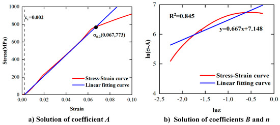 The strain hardening coefficient can be obtained by processing the quasi-static compression test data at room temperature. The proposed constitutive model is simplified as shown in Equation (17). The quasi-static compression tests permitted to determine the yield stress are represented by coefficient A (Figure 13a). Equation (18) was obtained by taking the logarithm on both sides of the Equation (17). The solution of the coefficients n and B can be obtained by a slope and an intercept of a fitting straight line (Figure 13b). As shown in Figure 12, A = σ0.2 = 773 MPa, n = 0.667, B = 1271 MPa.