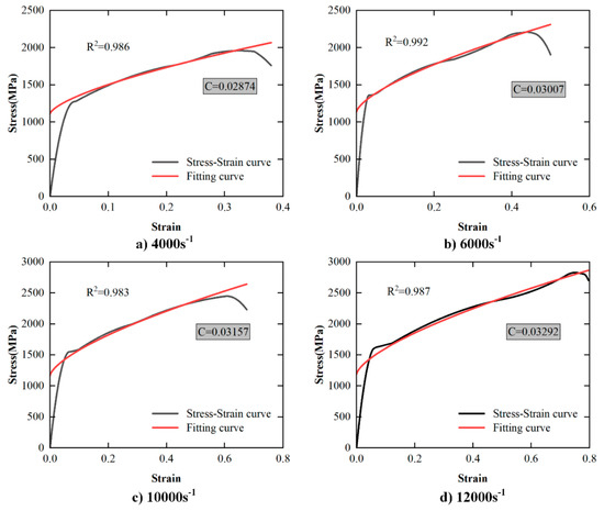 According to SHPB tests at room temperature for different strain rates, the constitutive equation is simplified to Equation (19). The stress–strain curves of materials at different strain rates at room temperature in this paper are shown in Figure 14. The mean value of multiple sets of test results is taken as the final result (C = 0.031).