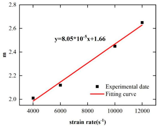 The thermal softening coefficient m is determined according to Equation (20). The data of the SHPB tests under high-temperature conditions were used. Finally, the fitting relationship between m and strain rate is obtained as shown in Figure 15.
