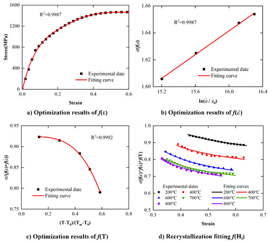 The stress values corresponding to the room temperature T0 and the reference strain rate ε0 conditions are selected as the initial values. The quasi-static compression test data at room temperature are selected for polynomial fitting to obtain the results of f(ε), which are shown in Figure 16a. Then, according to the relationship between measured stress in the SHPB test at room temperature and f(ε), the relationship between stress and strain rate is obtained by iteration, which is f() as shown in Figure 16b. Finally, the results of f(T) and f(Hi) can be obtained according to the high-temperature SHPB experimental data by the iteration process, as shown in Figure 16c and Figure 16d, respectively.