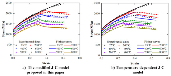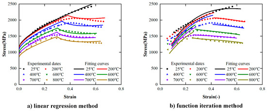To optimize the solution method of the parameters, the stress–strain curves obtained by the constitutive equations solved by the two methods described in the previous section are compared with the experimental results. Under the condition of strain rate is 10,000 s−1 and the temperature is 25 °C, 200 °C, 400 °C, 600 °C, 700 °C, 800 °C, the comparison results of stress–strain curves are shown in Figure 17. Figure 17a,b are the experimental comparison results of the linear regression solving method and functional iteration solving method, respectively. According to Figure 16, both of the equations obtained by the linear regression solving method and functional iteration method can describe the trend of stress in the plastic deformation stage.
