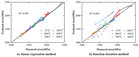 To quantitatively evaluate the overall error of the two methods, the scatter plot is used to calculate the correlation value. The results of the correlation between the calculated stress and the experimental stress obtained by the two methods are shown in Figure 18. Figure 18a,b are the results of the linear regression solving method and functional iteration solving method, respectively. Compared with Figure 18b (R2 = 0.889), the data correlation index in Figure 18a is higher (R2 = 0.985), namely, the data concentration is higher.