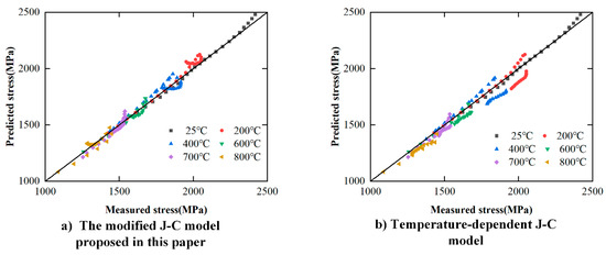 The comparison between the predicted stress and the experimental stress of the two modified models at the 10,000 s−1 strain rate is shown in Figure 19. Figure 19a,b are the comparison results of the model proposed in this paper and the temperature-dependent J-C model, respectively. The temperature-dependent J-C model can also predict the flow stress in the plastic deformation stage.