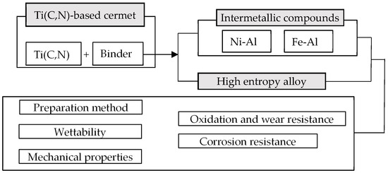 At present, There has been a great deal of research on new binders for cermets, which mainly include intermetallic compounds and high-entropy alloys. Intermetallic compounds are compounds composed of two or more metal elements, with excellent mechanical properties and high temperature stability. High-entropy alloys are alloys composed of five or more metal elements with excellent properties such as high strength, high hardness, wear resistance, and oxidation resistance. In this review, we will start from the Ti(C,N)-based cermets with these two binders and elaborate on the relevant research progress on their microstructure, mechanical properties, wear resistance, high-temperature oxidation resistance, and corrosion resistance to explore the mechanism of the influence of the new binders on the cermets’ organization and properties [44,45,46]. The development of new binder phases for Ti(C,N)-based cermets is also prospected, with a view toward providing a theoretical basis for the preparation of new cermets with excellent comprehensive performance. The structural framework of this paper is shown in Figure 3, which discusses the preparation method, wettability, mechanical properties, oxidation resistance, and corrosion resistance of the binder between intermetallic compounds and high-entropy alloys.