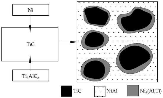 A novel TiC/Ni3(Al,Ti)-NiAl composite combining excellent flexural strength, high fracture toughness, and high Vickers hardness was prepared by reactive hot pressing and sintering of the powders of Ti3AlC2 and Ni at 1500 °C and 30 MPa. At high temperatures, the molten nickel promoted the decomposition of Ti3AlC2, and the released binder titanium atoms reacted with the nickel to form Ni3(Al,Ti) and NiAl alloys, which was accompanied by a lattice structure transformation from a hexagonal lattice Ti3AlC2 to a cubic lattice TiC. The NiAl binder molding process is shown in Figure 4. At room temperature, the hardness, flexural strength, and fracture toughness of the composites were 9.9 ± 0.35 GPa, 665 ± 26 MPa, and 10.23 ± 0.4 MPa·m1/2. As the temperature was increased from 600 °C to 800 °C, the flexural strength and fracture toughness increased and reached a maximum value of 775 ± 25 MPa and 11.6 ± 0.4 MPa·m1/2, respectively, at 800 °C. By analyzing the fracture mechanism, it was found that the TiC was transformed into a cubic lattice Ti3(Al,Ti), and interface debonding and cleavage of the binder NiAl compound were found to be the main fracture causes [60].