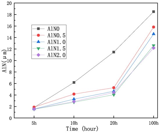 During oxidation under high-temperature conditions, the Ni3Al binder is oxidized to form the double-oxide NiAl2O4, which can effectively inhibit the diffusion of O2 in the oxide and, thus, reinforce the oxidation resistance of the metal–ceramic binder [78]. Ti in the hard phase is primarily oxidized to TiO2, while W and Mo are oxidized to WO3 and MoO3, respectively. The cross-section morphology of oxidized Ni3Al binder cermet consists of an oxide layer (OL), a transformation layer (TL), and a matrix. Some pores can be observed in the OL, and slight pores exist in the TL. By observing the SEM images of five Ti(C,N)-20 wt.%, WC-10 wt.%, Mo2C-2 wt %, TaC-7.5 wt.%, Ni-7.5 wt.%, and Co-xwt.%AlN with an AlN content x of 0, 0.5, 1.0, 1.5, and 2.0, respectively, with different oxidation times, it can be seen that, for each metal–ceramic, the overall thickness variation of the oxide layer on the surface is inversely proportional to the amount of Al added. The thicknesses are shown in Figure 5. This indicates that the addition of Al greatly improves the oxidation resistance of the metal cermets [79]. The thickness of the OL of Ni3Al binder cermet increases with increasing oxidation temperature and holding time. During the oxidation process, elements such as Al and Ti will diffuse outward from the inside of the cermet to the OL, while O2 will diffuse inward to the inside of the cermet to form an oxygen-permeable zone, i.e., the transition layer [80].