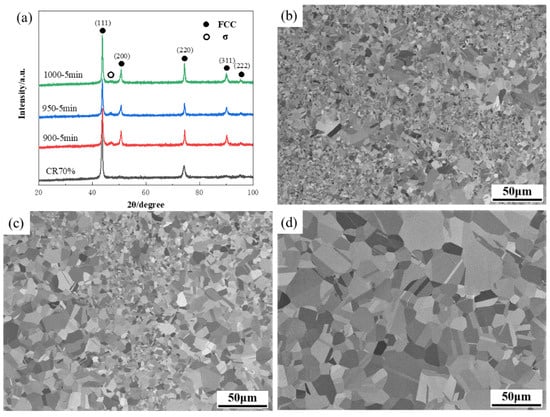 The XRD patterns of the annealed HEA are shown in Figure 1a. The diffraction peaks corresponding to the FCC (face center cubic) phase appeared in CR70 and A1000 HEAs, indicating that no precipitation or intermetallic compounds were produced during the annealing process. However, the corresponding diffraction peaks of the σ phase, rich in Cr, were generated in the A900 and A950 HEAs, and then disappeared in the A1000 HEA. Figure 1b–d show SEM-BSE images annealing at 900 °C, 950 °C, and 1000 °C, respectively. It can be seen that, after annealing at 900 °C and 950 °C, the recrystallized grain size of the alloy was uneven, and different forms of annealing twins were formed in some large grains. At the same time, a large number of white elliptical particles precipitated at the grain boundaries, which were in the σ phase and rich in Cr. After being annealed at 1000 °C, the grains begin to grow and complete recrystallization, and no σ phases were observed at the grain boundaries. An interesting finding is that the more uniform equiaxed grains with small numbers of twins were formed in A1000 HEA, as shown in Figure 1d. Through the relationship between grain size, annealing temperature, and annealing time, the classical theory of grain growth kinetics can be used to calculate the activation energy in grain growth for (Fe50Mn30Co10Cr10) 97C2Mo1 HEA. The calculation formula is as follows [21,22]: