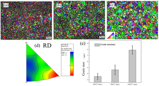 IPF diagram and grain size distribution diagram. (a) A900, (b) A950, (c) A1000. (d) Reverse pole diagram corresponding to A1000 HEA, (e) grain size distribution diagram.