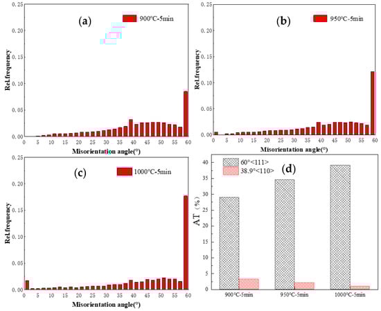 Figure 3 shows the misorientation angle distribution maps of HEA. The densities of the subgrain boundary dislocations formed after cold rolling were relatively higher. Migration occurred after annealing, and it transformed into a large angle grain boundary. Therefore, the main characteristic of the HEA is a large number of large angle grain boundaries corresponding to 15° to 58° RD. Additionally, the peaks corresponding to the 0–2° substructure also slightly increased as the annealing temperature increased, indicating the presence of a small amount of substructure in A1000 HEA. It was also observed that the peaks of 38.9° and 60° were significantly higher. The 60° peak is generally defined as a 60°<111> orientation Σ3 first-order twin boundary, and the 38.9° peak is defined as a 38.9°<110> orientation Σ9 s order twin boundary. According to Otto et al. [27], the volume fraction of Σ3 twin boundaries increases when the annealing temperature increases, while the volume fraction of Σ9 twin grain boundaries decreases with the increase in the annealing temperature. As can be seen from Figure 3d, the increase in the volume fraction of the annealing twins was directly proportional to the grain size of the recrystallized grains. Accordingly, the 60°<111> orientation annealing twins in A1000 HEA had the highest volume fraction.