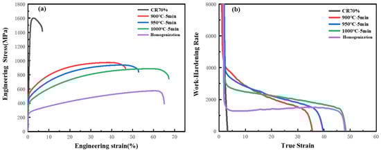 The room-temperature tensile curve of the annealed HEA. (a) Engineering stress–strain curve, (b) work hardening rate curve.