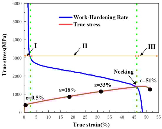 True stress–strain curve and work hardening rate curve of A1000 HEA.