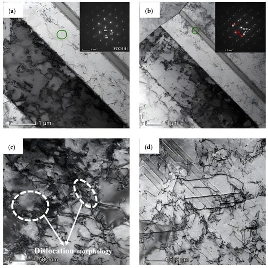 TEM images of A1000 HEA. (a,b) Bright field image (the insets are selected diffraction patterns of the green circle); (c,d) dislocation morphology.