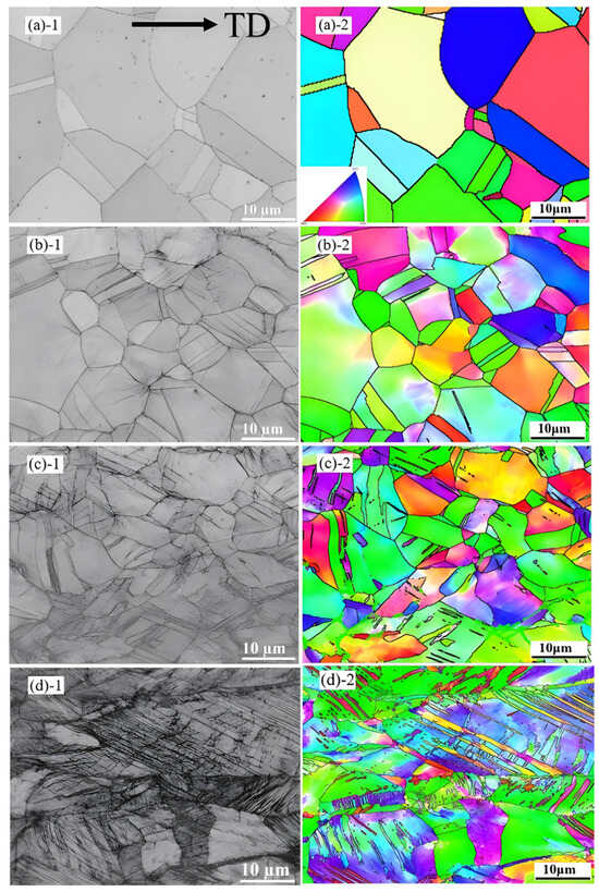 EBSD-BC diagrams of the A1000 HEA under different strains. (a-1,a-2) ε = 0.5%, (b-1,b-2) ε = 18%, (c-1,c-2) ε = 33%, (d-1,d-2) ε = 51%.