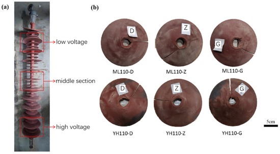 (1) The umbrella skirts operating in the southern border area have been affected by ultraviolet rays, wind, sand, and other aging factors for a long time, which makes the surface of the umbrella skirts chalk and crack. The surface layer of PDMS has been oxidized and decomposed so that the inorganic filler is exposed on the surface to form a large number of inorganic particles and become rough;