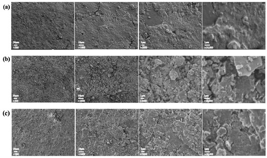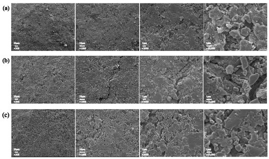 The surface morphologies of the umbrella skirts at the low voltage, the middle section, and the high voltage of the 110 kV Myli Line and the 110 kV Yuhe Line in the South Xinjiang region are shown in Figure 2 and Figure 3. From left to right, the surface morphologies of umbrella skirts are 300 times, 1000 times, 3000 times, and 10,000 times, respectively.