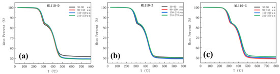 Thermal weight loss plots of umbrella skirts at different positions of ML110-D (a), ML110-Z (b), and ML110-G (c).