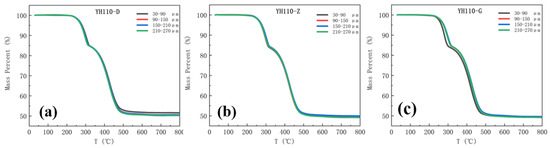 Thermal weight loss plots of umbrella skirts at different positions of YH110-D (a), YH110-Z (b), and YH110-G (c).