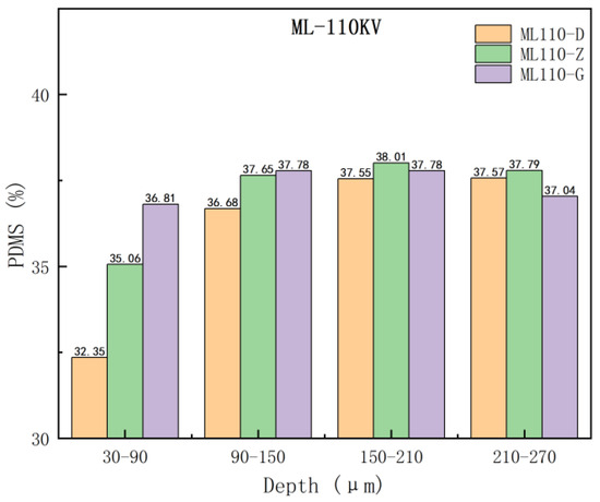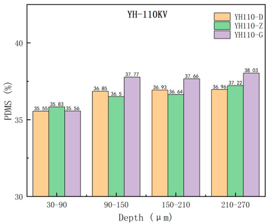 In Analysis Table 3 and Table 4, it can be seen that as the depth of each umbrella skirt sample increases, the content of its PDMS component also increases and gradually tends toward stabilization. The PDMS contents of the aging part of the umbrella skirts are relatively low and the content of the unaged part is relatively high, from which the aging depth of the umbrella skirts can be roughly judged. The different environments of each line will lead to the difference in the PDMS content of each line. From Figure 7 and Figure 8, we can determine that the aging depths of ML110-D, ML110-Z, and ML110-G are all within 150–210 µm; the aging depths of YH110-D, YH110-Z, and YH110-G are all within 150–210 µm.