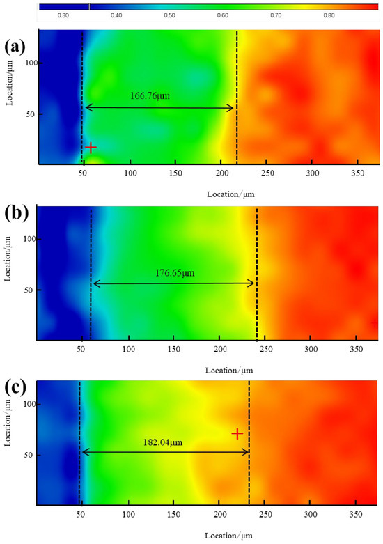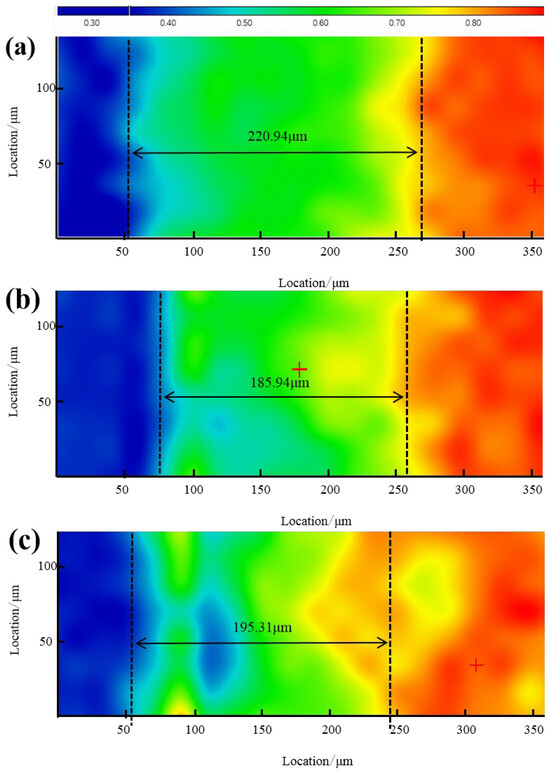 The micro-infrared results can visualize the aging depth of the umbrella skirts; the area distribution of the methyl peaks at wave number 2960 cm−1 is shown below. The blue color indicates that the absorption of the methyl peak is very low, indicating that the content of PDMS is very low; the red color indicates that the absorption of the methyl peak is high, indicating that the content of PDMS is high; and the area between the two is the aging area of the sample.
