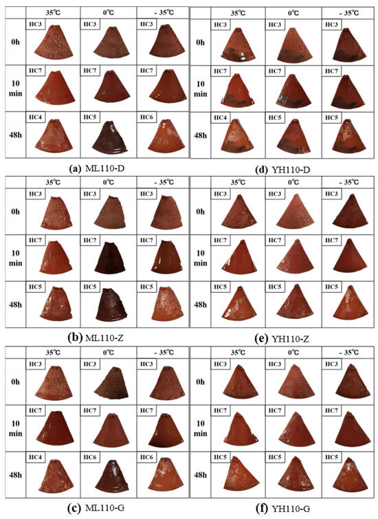 Recovery of the hydrophobicity of ML110-D (a), ML110-Z (b), ML110-G (c), YH110-D (d), YH110-Z (e), and YH110-G (f) at different temperatures.