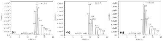 Chromatograms of different umbrella skirt samples of ML110-D (a), ML110-Z (b), and ML110-G (c).