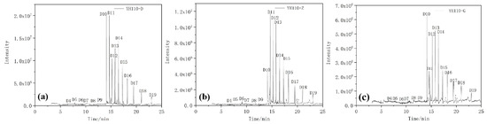 Chromatograms of different umbrella skirt samples of YH110-D (a), YH110-Z (b), and YH110-G (c).