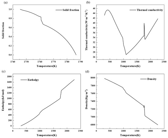 The thermal physical parameters used in the simulation process include enthalpy change, density thermal conductivity, solid phase ratio, etc., as shown in Figure 1. The liquidus is 1786 K, and the solid phase is 1751 K.