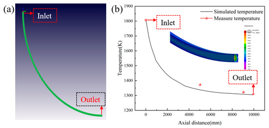 From Figure 3, the simulation data match at both ends. At the axial distance of 5500 mm, the measured temperature is 1373 K, while the simulated temperature is 1338 K; the reason for the error is in the measurement using the infrared thermometer, which measures the surface fluctuations and the temperature difference is large. The measured temperature at the axial distance of 10,000 mm is 1311 K, and the simulated temperature here is 1305 K; the relative error is 0.58%, and it can be considered that the model verification is accurate. After simulation verification, the calculation results of the final 50 mm of the whole process model were intercepted for analysis.