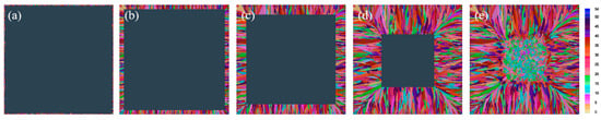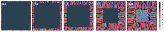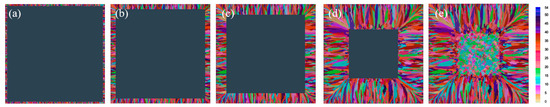 Low-temperature casting can reduce the internal and external temperature gradient of the billet and inhibit the growth of columnar crystals. This study simulated the solidification structure of the casting billet by changing the superheat [28,29]. In order to simplify the calculation of the simulation, the simulated temperature calculated in the model validation was used to simulate the model with a thickness of 50 mm. Figure 4 is the schematic diagram of the cross-sectional solidification process of the billet when the superheat is 60 K. Figure 5 is the schematic diagram of the cross-sectional solidification process of the billet when the superheat is 40 K. Figure 6 is the schematic diagram of the cross-sectional solidification process of the billet when the superheat is 20 K.