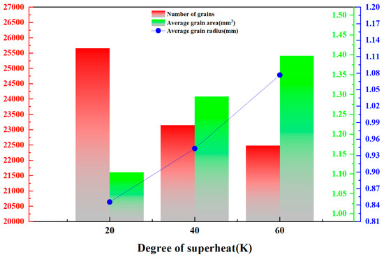 From Figure 7, the solidification organization is divided into three regions, the surface fine crystal region, the columnar crystal region and the central equiaxed crystal region. The evolution rule is that the fine crystal zone on the surface of the ingot gradually develops into a coarse columnar crystal zone along the radial direction, while the central part of the ingot is the equiaxed crystal zone, and the simulated solidification tissue evolution is in accordance with the solidification theory. It is obvious from the solidification tissue growth state that the size of columnar crystals becomes larger and larger as the superheat increases, and the original growth area of equiaxed crystals is occupied by columnar crystals, while the growth area of equiaxed crystals decreases in scope and the size of equiaxed crystals also increases slightly. In order to analyze the simulation results in detail, the isometric crystal size measurements were performed using ImageJ 1.8.0 software. Table 3 shows the calculation results about the number of grains, etc., under different superheat degrees, and Figure 8 shows the effect of different superheat degrees on the isometric crystal size.