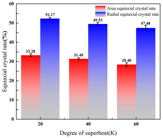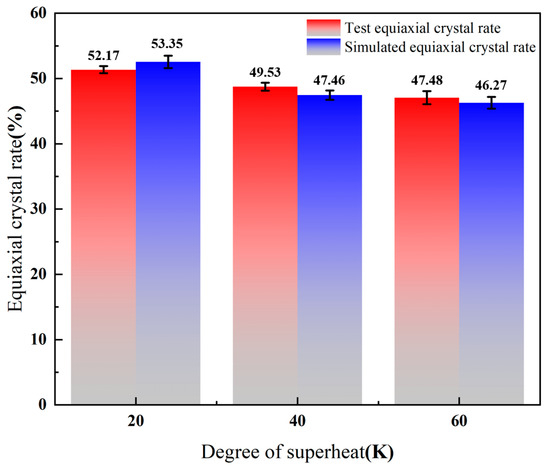 From Figure 10, with the increase of superheat, the area equiaxed crystal rate decreases from 33.28% to 28.48%, and the radial equiaxed crystal rate decreases from 52.17% to 47.48%. Therefore, the equiaxed crystal rate decreases with the increase of superheat. The change of superheat mainly affects the growth of columnar crystals and the formation of equiaxed crystal regions. In the case of low superheat, the grain growth may be more random, resulting in a more uniform grain orientation distribution in the final billet, leading to a more dense equiaxed grain [30]. At the same time, a lower superheat may produce a relatively uniform texture. The formation of texture is closely related to the orientation of grain, which has a significant effect on the anisotropy and mechanical properties of the material [31]. The effect of superheat on crystal direction is realized by adjusting the mode and orientation of grain growth. In the continuous casting process, the orientation distribution of the crystals during solidification can be adjusted by controlling the superheat, thus affecting the microstructure and macroscopic properties of the final casting billet [32]. Figure 11 shows the effect of different superheat degrees on the equiaxed crystal rate of cast billets. Figure 12 shows the comparison between the simulated results and the test results on the equiaxed crystal rate of the casting billet under different superheat conditions.