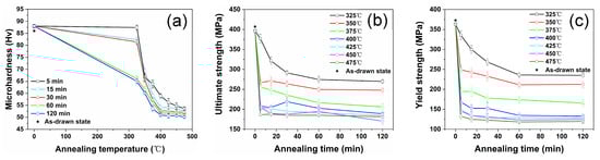 Mechanical property curves of the experimental wires, showing annealing treatment on (a) the microhardness, (b) the ultimate strength, and (c) the yield strength.