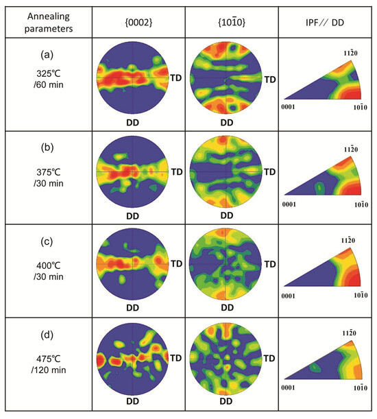 Deformed Mg and its alloys undergo SRX during the annealing process, resulting in changes in the texture components and the formation of annealing texture. The formed annealing texture is closely related to the microstructure and is influenced by various factors, such as deformation texture, the alloying element, annealing temperature, and time [25]. When annealed at a lower temperature (325 °C/60 min), the G4.7 began to undergo recrystallization, with a weaker basal texture and a {0002} polar density of 3.163 m.r.d. Simultaneously, a main texture component <100>//DD was also contained. This was closely related to the strong deformation texture of the G4.7 wire before annealing, which was a strong <100> fiber texture, as detailed in our previous paper [11]. With the process of SRX (375, 400 °C), the basal texture component was markedly strengthened. Continuously heating up to 475 °C, the recrystallized grains significantly grew, accompanied by a more pronounced {0002} basal texture, with a strength of 11.635 m.r.d; that is, as the annealing temperature increased and recrystallization proceeded, the basal texture of the G4.7 was gradually enhanced. Simultaneously, the texture component <100>//DD was gradually weakened. Overall, the texture of the as-annealed wire was relatively weak and the orientation distribution of the grains was relatively random at 375 °C/30 min, which was beneficial for the coordination of the plastic deformation.