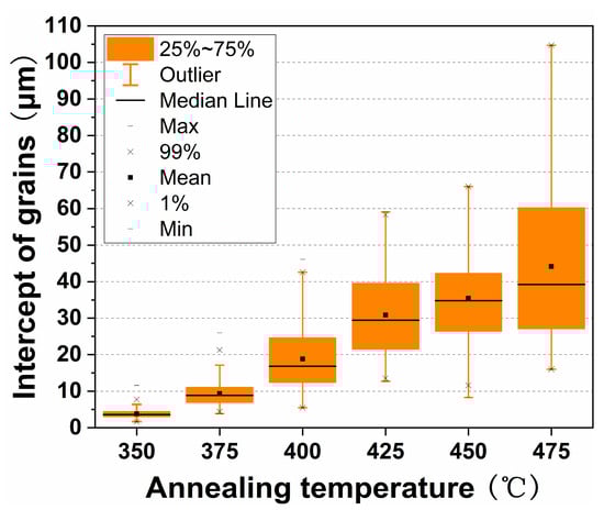 In addition, the influence of the as-annealed microstructure on the subsequent cold-drawn deformability is mainly reflected in the following aspects: the grain sizes and their uniformity and regularity. Through severe plastic deformation, some processing techniques (e.g., reciprocating extrusion [23] and high-pressure torsion [24]) can significantly refine grains. In this work, fine grain microstructures could also be obtained through cold drawing at room temperature and the subsequent annealing treatment. Based on the microstructure of the G4.7 wire, the distribution of the recrystallized grain size after annealing at different temperatures for 30 min was statistically analyzed, as shown in Figure 6. It can be seen that the grain size of the G4.7 gradually increased with the increasing annealing temperature. After annealing at 350~400 °C for 30 min, the recrystallized grain size of the G4.7 was lower than that of the as-extruded G4.7 (~21 μm). With the continuing temperature increase, the grains grew rapidly and the size was larger than that of the as-extruded wire. Additionally, after annealing at higher temperatures, the uniformity of the recrystallized grains was relatively poor; this can be seen in Figure 6, where the distribution of the grain size is very wide. For example, after annealing at 475 °C, the average grain size was ~44 μm, with a minimum grain size of ~16 μm and a maximum grain size of ~105 μm. By this point, the small grains were distributed around the large grains, which are also clearly visible in the metallographic photos. On the other hand, despite the fact that the grains were refined after annealing at a lower temperature (350 °C/30 min), the uniformity and regularity of the grains were poor due to incomplete recrystallization of the wires at this point. These inhomogeneous and disequilibrium grains resulted in a drawing performance, which led to premature crack initiation during a large deformation of the wires. Therefore, the cold drawing deformability of the G4.7 wire annealed at 350 °C was significantly lower than that of the as-extruded wire (Table 1). In contrast, as the temperature increased to 375 °C, the CV value decreased to 0.34 and a complete SRX occurred. Thus, the improvement of the uniformity and regularity of the recrystallized grains contributed to a better subsequent cold deformation, despite the coarser grains.