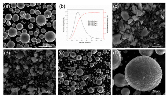 Al-Mg raw powders were produced by centrifugal atomization after melting in a vacuum induction furnace, and they were basically spherical (Figure 1a). The median particle size of the powders was 38.70 μm (Figure 1b). The elemental composition of the raw Al-Mg powders, excluding Al, was 5% Mg and 0.5% Mn. TiH2 (Figure 1c) and ScH3 (Figure 1d) particles were prepared using a high-energy ball milling method, and the size distribution of these irregular particles was about 1~10 μm. The corresponding compositions of powders used in this work are shown in Table 1. All the composite powders were prepared via low-energy ball milling under an Argon atmosphere. The ball milling parameters were as follows: the ball-to-material ratio was 5:1, the ball mill speed was 140 rpm and the mixing time was 4 h. Figure 1e,f presents the SEM photographs of the BST2 composite powders. It can be seen that the spherical Al-Mg powders barely changed in shape as a result of the milling process. In addition, composite powders were dried at 100 °C for 8 h in a vacuum dryer before the LPBF process.