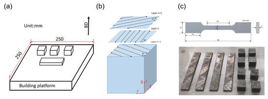 The composite powders were loaded in an EOS M280 AM system (EOS GmbH, Krailling, Germany). The preheated temperature of this system was set to 200 °C, and the maximum building zone of this system is 250 × 250 mm2 (Figure 2a). The cavity was filled with argon gas during the whole printing process. The laser applied rotated by 67° between adjacent layers following a striped pattern (Figure 2b). The optimized LPBF processing parameters are listed in Table 2. Two kinds of samples were fabricated. The size of cube samples was 10 mm × 10 mm × 10 mm, and the size of strip samples was 65 mm × 10 mm × 2.1 mm. The building direction was perpendicular to the XOZ plane.