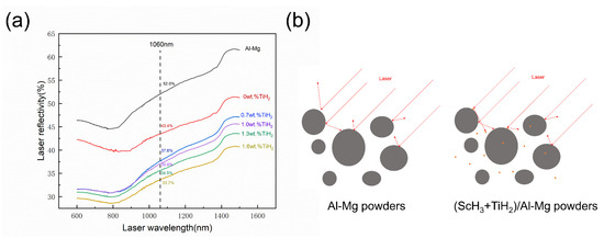 (a) The laser reflectivity of the composite powders. (b) Schematic diagram of the laser acting on the powders.