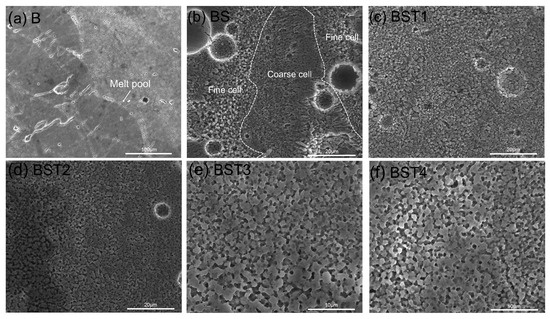 SEM images showing the XOZ plane of samples after etching by the Keller reagent: (a) B sample, (b) BS sample, (c) BST1 sample, (d) BST2 sample, (e) BST3 sample, (f) BST4 sample.