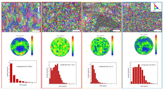 IPF maps, pole figures and grain size distribution images along the building direction of as -fabricated samples: (a) B, (b) BST1, (c) BST2, (d) BST3.