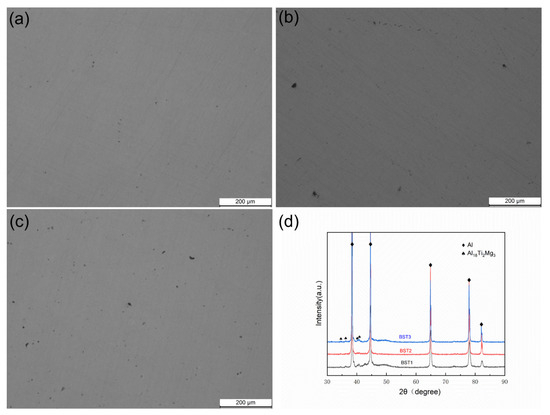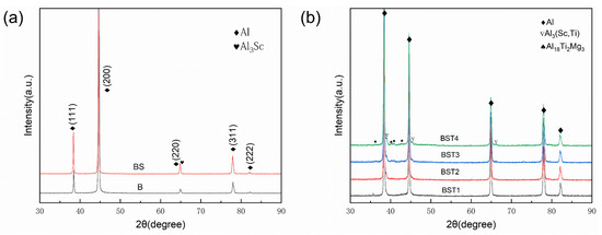 Figure 7a shows the XRD patterns of the as-fabricated B and BS samples. The diffraction of Al peaks is clearly visible in these as-fabricated samples. However, the intensity of Al peaks for these samples differs from the standard α-Al phase, which may be caused by the epitaxial growth of columnar grains in these samples. Additionally, the diffraction of the Al3Sc peak exists in the BS sample. The XRD patterns of the as-fabricated BST group samples are illustrated in Figure 7b. It can be seen that the diffraction of Al peaks of these samples is consistent with the standard α-Al phase due to the elimination of columnar grains. In addition, peaks of Al3(Sc,Ti) and Al18Ti2Mg3 are visible, and the BST4 samples exhibit the highest peak intensity of these phases. The Al18Ti2Mg3 is a common phase in the Al-Mg-Ti alloys, which has been exhibited in other studies [32,33]. Phases containing Mn cannot be found in all samples due to their contents.
