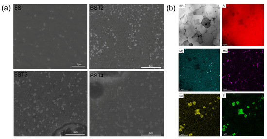 A combination of other assays is needed to confirm the results of the phase identification via XRD. Figure 8a shows the shape of precipitates in the as-fabricated samples. The precipitates in the BS sample are assumed to be Al3Sc, according to the XRD results, and the precipitates in the BST group samples should be Al3(Sc,Ti). Most of these precipitates are irregularly shaped, and only a small number of these precipitates are nearly square. The bright image and corresponding EDS mappings of the BST2 sample are shown in Figure 8b. The results show that only a small amount of Mg and Mn have precipitated from the Al matrix. Mg is basically evenly distributed, and Mn is enriched around the grain boundaries. Obviously, Sc and Ti accumulate in the same precipitates, and these particles are mainly distributed within the grain boundaries.