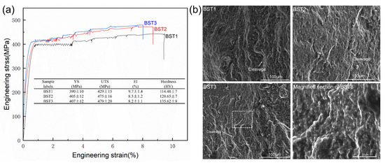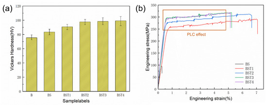 Mechanical properties of the as-fabricated samples: (a)Vickers Hardness; (b) stress–strain curves of as-fabricated BS and BST group samples.