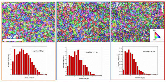 Figure 5 depicts the grain microstructures of these as-fabricated samples on the XOZ plane. As shown in Figure 5a, these molten pools exhibit corrugation, and cracks on the XOZ surface are generated nearly perpendicular to the molten pool. Both coarse columnar grains and fine equiaxed grains exist in the BS samples, and the distribution of these cells is affected by the melt pool boundary (white lines in Figure 5b). Additionally, the growth direction of the columnar grains inside the molten pool is approximately parallel to the building direction. Conversely, the BST group samples have a fine-grain structure without columnar grains. In addition, the pores affected the size of the grains. The results demonstrate that the addition of TiH2 and ScH3 can convert columnar grains to equiaxed grains in the printing process. Furthermore, the distribution of grains is more uniform and the grain size becomes smaller with the increase in Ti content.
