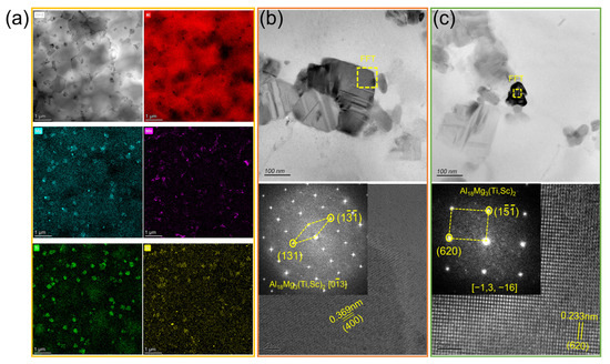Figure 14 shows the TEM results of the HIPed BST2 sample. Compared with the TEM results of the as-fabricated BST2 sample, it can be deduced that massive Mn and Mg elements precipitate from the matrix during the HIP treatment. Mn still enriches around the grain boundaries. Moreover, the phenomenon that Sc and Ti accumulate in the same zones still exists. Differing from the as-fabricated sample, Mg also accumulates in these zones. There are two distinct precipitates in the matrix, and their morphologies are shown in Figure 14b,c. These precipitates were identified by the HRTEM and the corresponding FFT. According to these results, it can be concluded that these two different precipitates are both Al18Mg3(Ti,Sc)2. Additionally, no orientation relationship exists between these Al18Mg3(Ti,Sc)2 precipitates and the matrix.