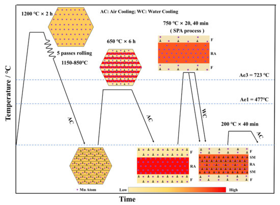 The nominal composition of the studied steel is Fe–0.22C–0.31Si–5.24Mn–0.26Mo–0.15V–0.026Ti (wt.%). The steel was smelted in a 50 kg vacuum induction furnace. After casting, the steel was forged into a billet with cross-section dimensions of 150 mm and 60 mm. The steel was rolled from 60 mm into a final thickness of 20 mm by several passes, with air cooling to ambient temperature. Subsequently, the hot-rolled steel was subjected to a multistep heat treatment, as shown in Figure 1. The steel was reheated to 650 °C to trigger the RA transformation to dissolve cementite. The heat preservation time was about 6 h for adequate Mn partition. The SPA process was performed at 750 °C with total time of 20 and 40 min in the furnace (namely, SPA20 and SPA 40) after 650 °C IT (referred as IT650), respectively, subsequent with water cooling to room temperature. In order to eliminate quenching stress, a low-temperature process of 200 °C for 40 min was performed.