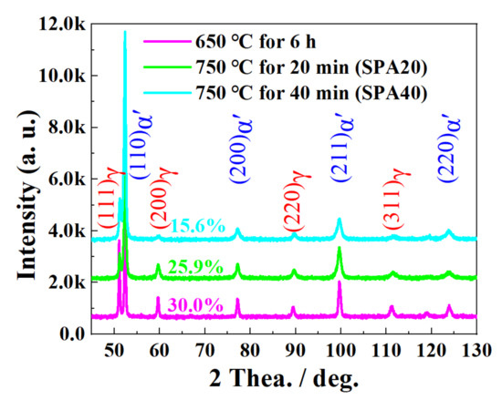 As shown in Figure 5, the estimated content of RA was about 30.0%, 25.9%, and 15.6% for IT650, SPA20, and SPA40, respectively. The result showed that part of the RA of IT650 transformed in to martensite. Limited by the measurement accuracy of EBSD, the RA content detected by XRD was used for the subsequent strengthening mechanism analysis. Furthermore, the width of diffraction peaks of α-Fe and γ-Fe increased after being subjected to SPA treatment, indicating the higher dislocation density in austenite and martensite [24]. Another phenomenon was located where the diffraction peaks of γ-Fe shifted toward the right, implying the lower carbon content in RA [1].