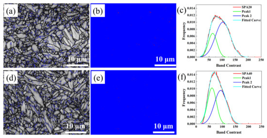 EBSD images: (a) band contrast image, (b) phase image, and (c) band contrast curves of SPA20; (d) band contrast image, (e) phase image, and (f) band contrast curves of SPA40. (c,f) The band contrast peak of SPA20 and SPA40 was divided into two peaks of F and SM. Coarse black lines and fine blue lines represent the high-angle grain boundary (>15°) and low-angle grain boundary (2~15°), respectively.